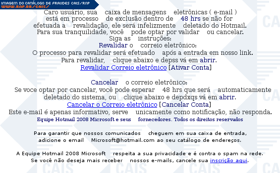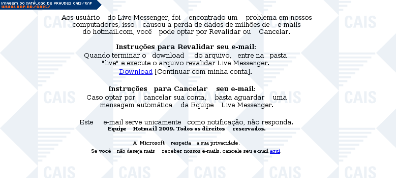 | comentário | Mensagem com suposto alerta do hotmail a respeito do cancelamento de conta de email. A mensagem pede que um software seja baixado para revalidar a conta. Tal software malicioso não estava disponível no momento da análise. | |