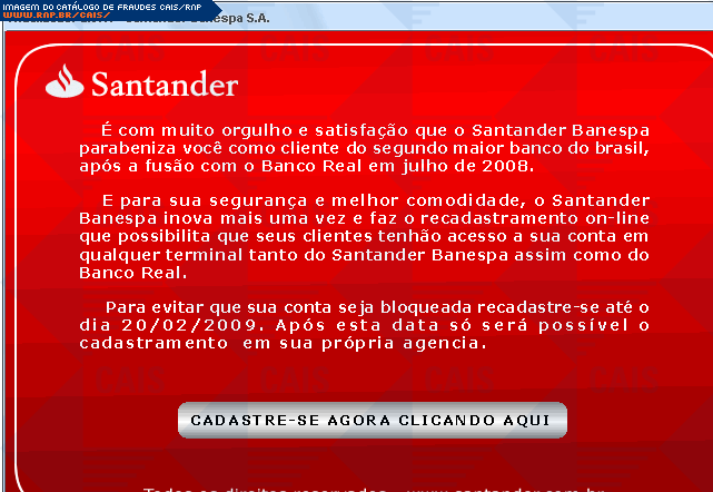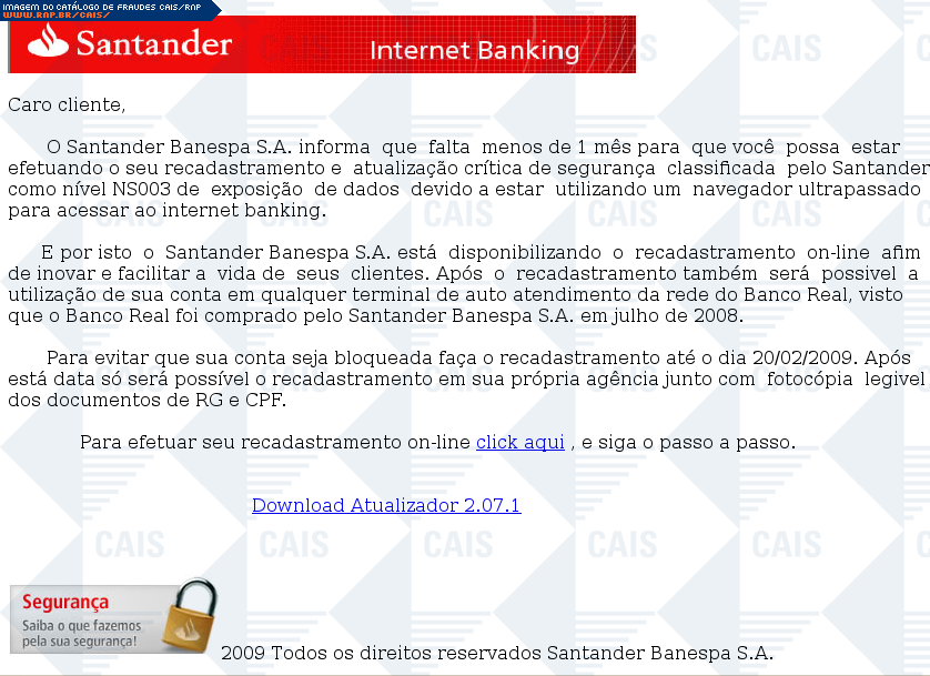 | comentário | Fraude que usa o nome do Banco Santander. A mensagem instrui o usuário a efetuar recadastramento da conta e fazer uma atualização crítica de segurança. O e-mail apresenta informações verídicas (compra do Banco Real pelo Santander) para dar maior credibilidade... (leia mais) | |