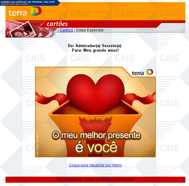 | comentário | Mensagem que se passa por um cartão virtual do portal Terra, com uma mensagem de amor. O link para visualização do cartão leva ao software malicioso Suspicious:W32/Malware!Gemini (F-Secure). | |