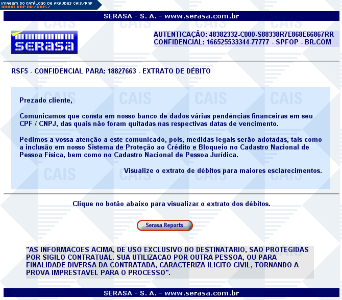 | comentário | Fraude que usa o nome da empresa SERASA. Na mensagem a vítima é informada de que existem pendências financeiras e que ela deve visualizar o extrato de débito para maiores esclarecimentos. O arquivo malicioso atrelado ao link "Serasa Reports" foi identificado... (leia mais) | |