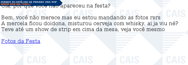 | comentário | Mensagem com link para supostas imagens de uma festa. O link leva a um software malicioso identificado como Heur.Downloader (Kaspersky) | |