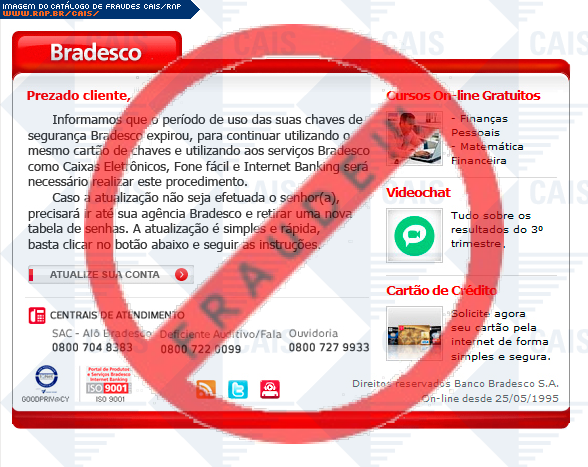 | comentário | O usuário recebe um e-mail informando que sua chave de segurança da conta do banco Bradesco expirou sendo necessário realizar uma atualização no link disponibilizado, entretanto a página fornecida é falsa criada para roubar os dados bancários da vítima. | |