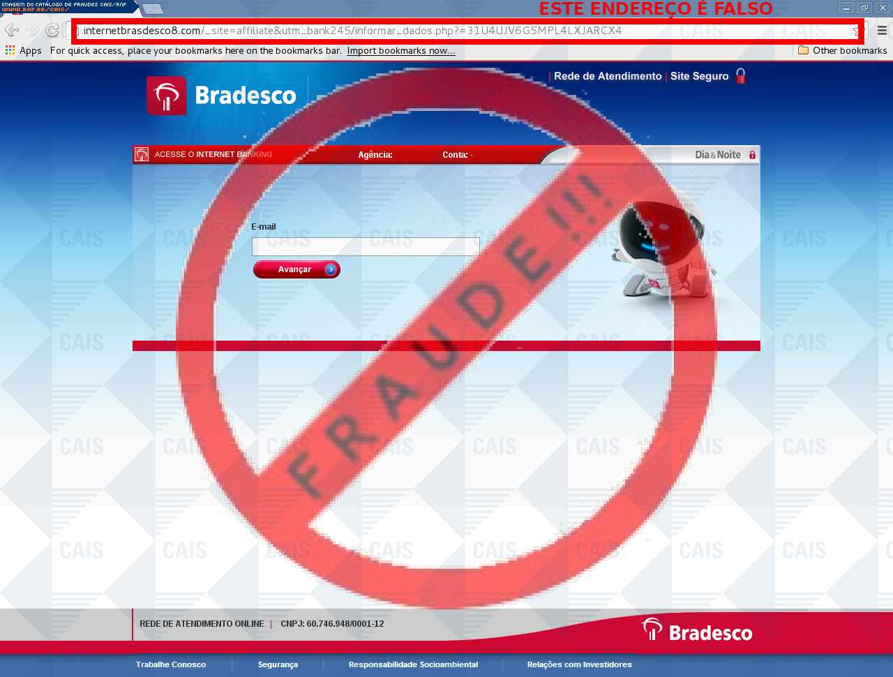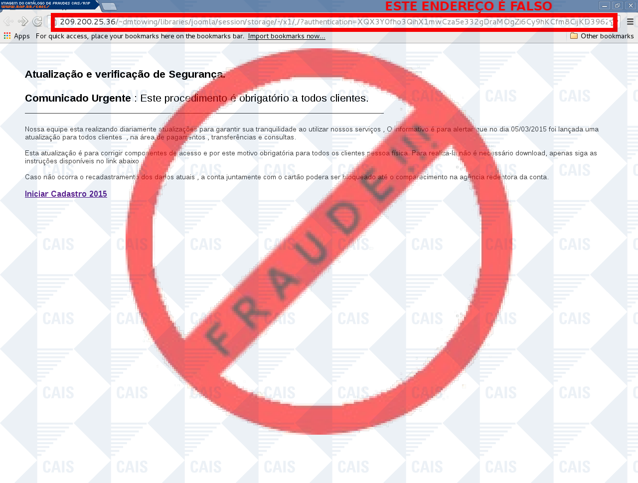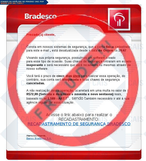 Esta página tem função informativa e educativa. Exibe uma coleção de imagens de phishing scam (fraudes eletrônicas) ou malware (código malicioso) veiculados por meio de spam (e-mail não-solicitado). Trata-se de conteúdo exemplificativo, não exaustivo, uma vez que não é possível contemplar todos os casos de fraudes existentes. Assim, caso você tenha conhecimento de um exemplar que não esteja aqui presente, isto não significa que não seja válido ou real. Inclusive incentivamos que você o envie para análise do CAIS para que, se for o caso, passe a integrar o nosso acervo.