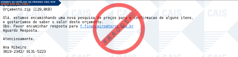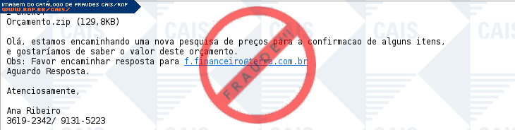 | comentário | O usuário recebe uma mensagem contendo um orçamento disponível em anexo, no entanto o arquivo originado é malicioso criado para roubar informações da vítima e instalar outros arquivos fraudulentos com o nome de Trojan/Win32.Banker. | |