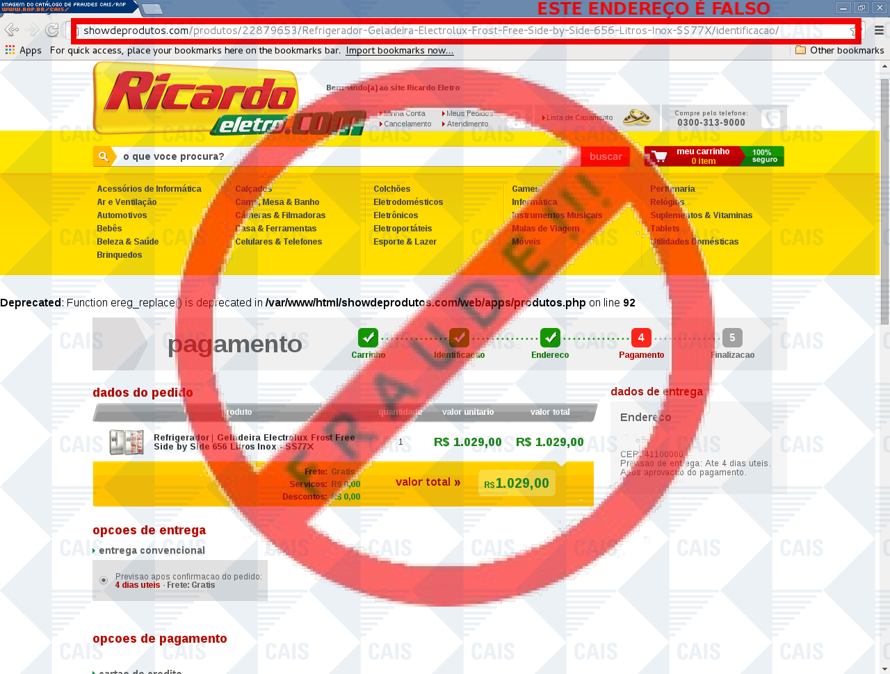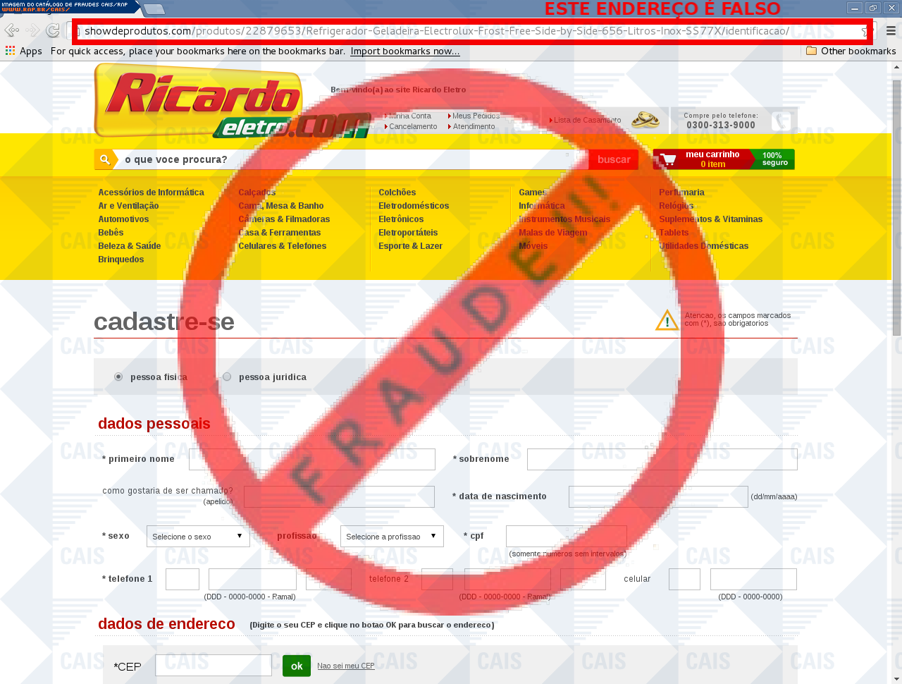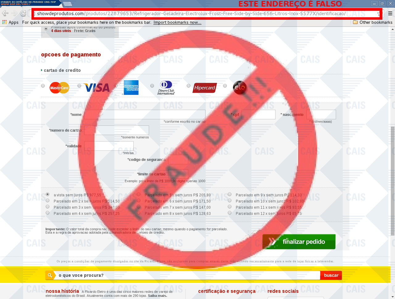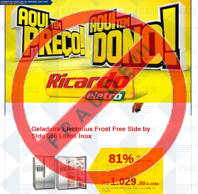| comentário | A vítima recebe um e-mail informando sobre promoções no site de compra da Ricardo Eletro disponibilizando link de vários produtos em desconto, no entanto a página é falsa destinada a roubar as informações pessoais e do cartão do usuário. | |