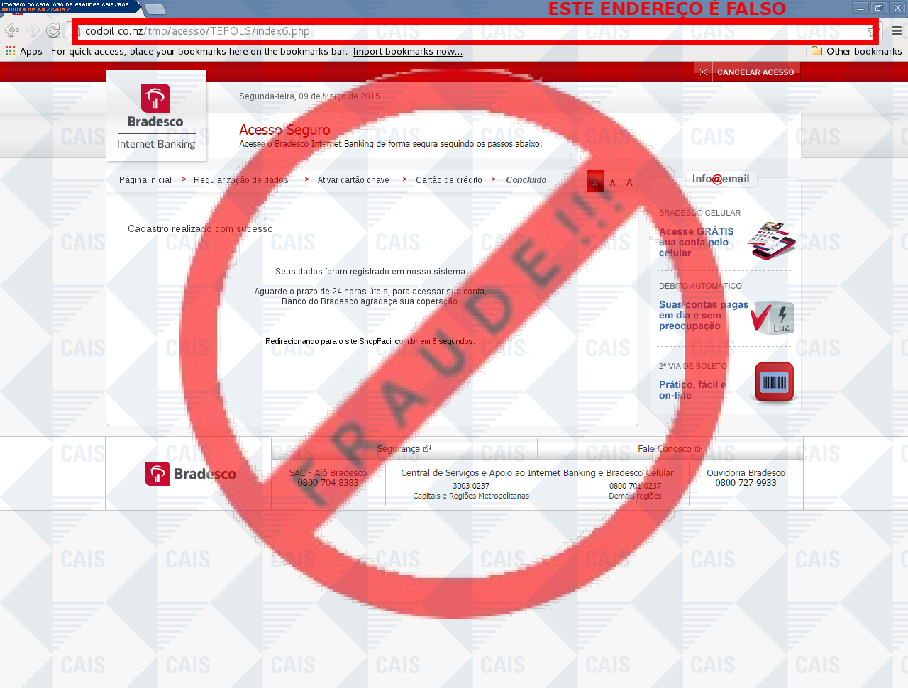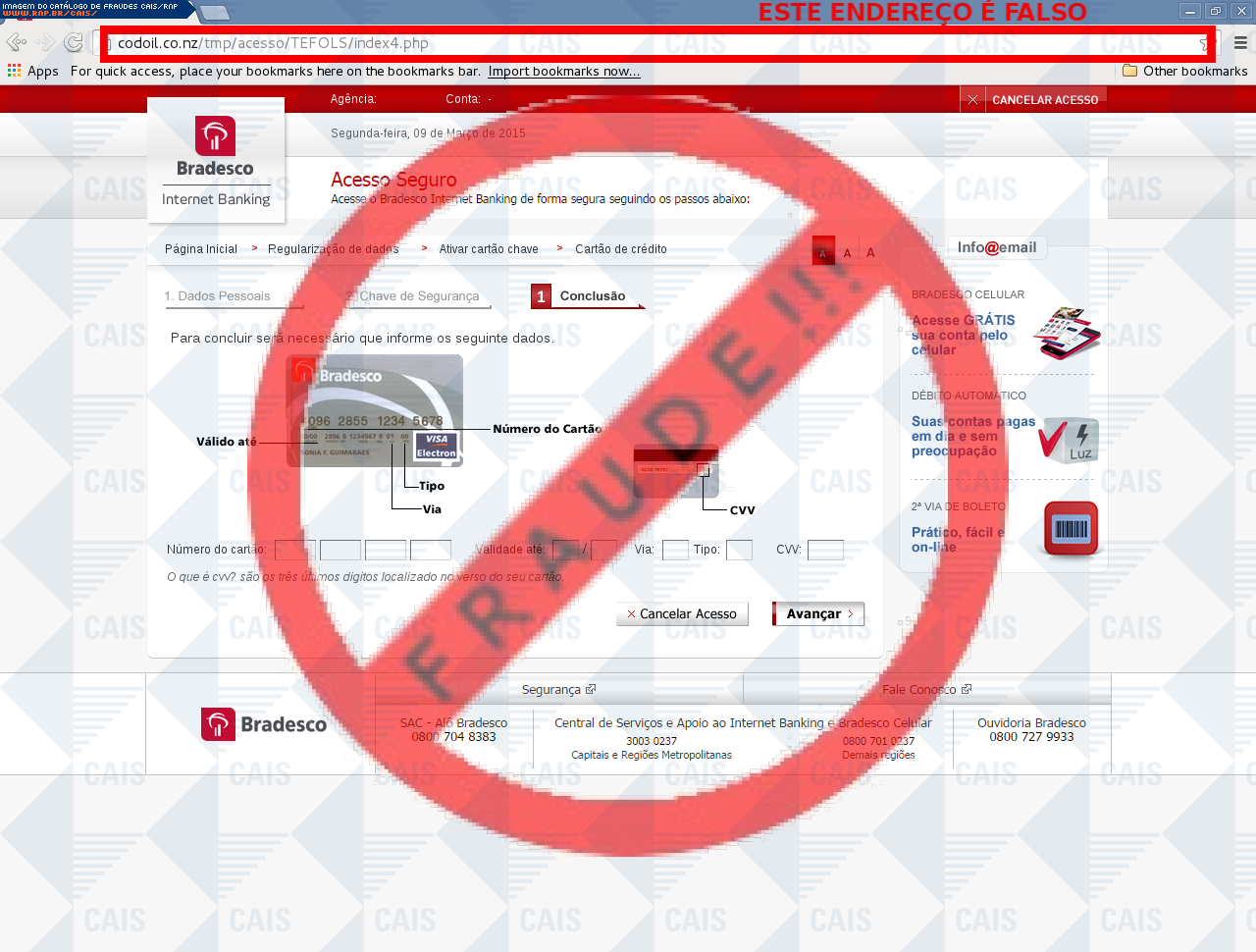 | comentário | A vítima recebe uma mensagem informando que sua conta no banco Bradesco esta desatualizada sendo necessário acessar o link disponibilizado, no entanto a página é falsa destinada a roubar as informações bancárias do usuário. | |