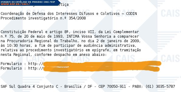 | comentário | Mensagem que traz dados sobre uma suposta intimação da Procuradoria Regional da Justiça. A mensagem contêm dois links e um deles redireciona para o software malicioso: W32/Downloader.TGH (Norman). | |