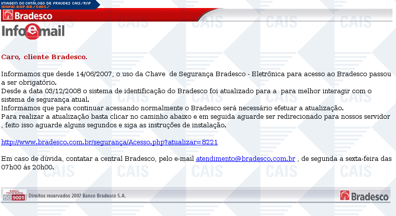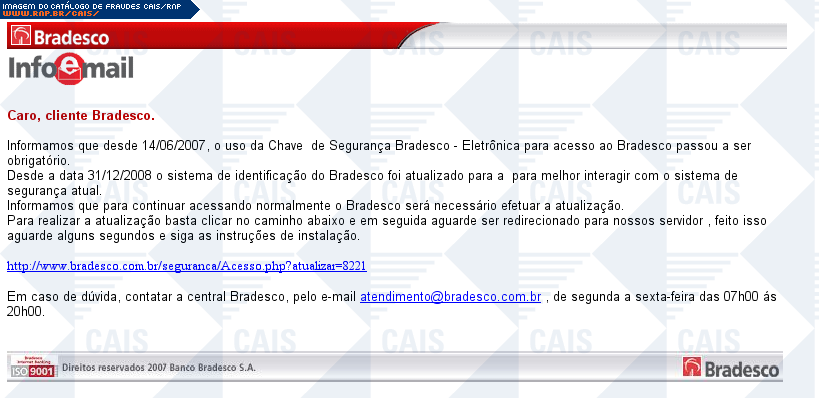 | comentário | Mensagem que se passa por um comunicado aos clientes do Banco Bradesco informando sobre a necessidade de atualização e do uso de chaves de segurança para acesso ao banco. O link para o software malicioso não estava mais disponível no momento da análise. | |