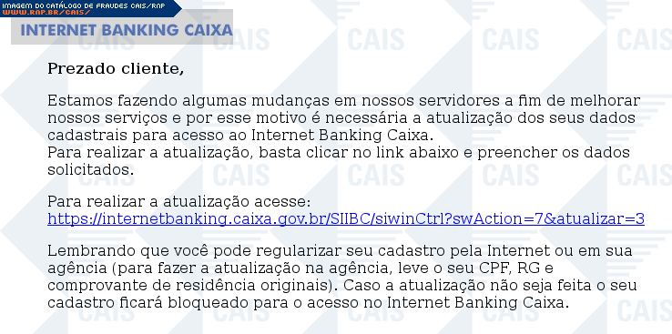 | comentário | Mensagem que se passa por um comunicado da Caixa Econômica Federal. A mensagem informa o usuário sobre a necessidade de atualização dos dados cadastrais para acesso ao Internet Banking. A mensagem inclui uma imagem do site original da Caixa com HTTPS, e apresenta... (leia mais) | |