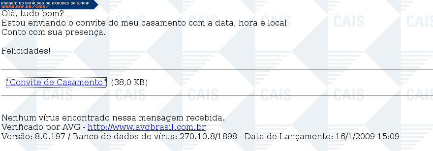| comentário | Mensagem que apresenta um link para um suposto convite virtual de casamento. O software malicioso da amostra não estava mais disponível no momento da análise. | |