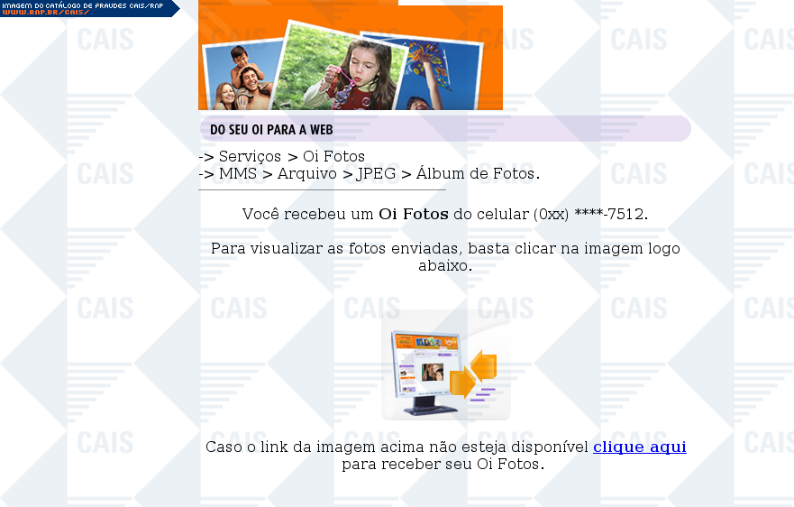 | comentário | Mensagem supostamente enviada por celular da Oi contendo link para visualização das fotos. O link leva ao arquivo malicioso identificado como Heur.Downloader (Karspersky). | |