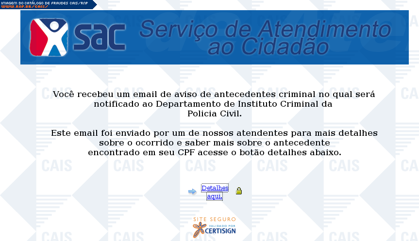 | comentário | Mensagem se passando por uma notificação de antecedente criminal. Um link que mostraria detalhes da notificação leva a um software malicioso identificado como Heur.Downloader (Kaspersky). | |