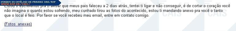 | comentário | Fraude que informa sobre o falecimento dos pais e pede que entre em contato após ver as fotos. O arquivo malicioso, fotos_anexas.com, atrelado ao linl "fotos anexas" foi identificado por antivirus como Trojan-Downloader.Win32.Banload.hhr | |