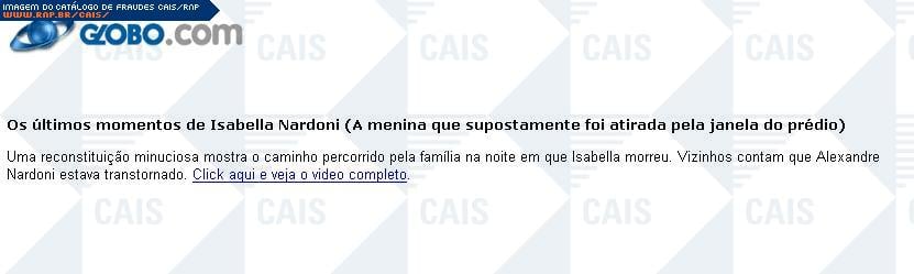 | comentário | Fraude que utiliza a tragédia ocorrida com a menina Isabella Nardoni para que o usuário "clique" em um suposto vídeo. O arquivo malicioso atrelado ao link, isabela.Video.exe, foi identificado por antivirus como Downloader.Bancos. | |