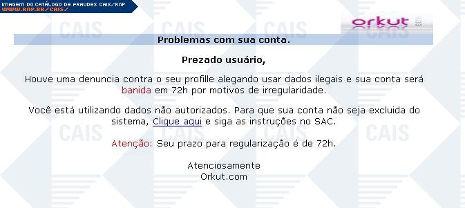 | comentário | Fraude que utiliza o nome do site de relacionamentos Orkut, indicando que a conta será cancelada em 72 horas por estar utilizando dados ilegais. O link disponível com as instruções "clique aqui" direciona a vítima para uma página que informa que a versão... (leia mais) | |