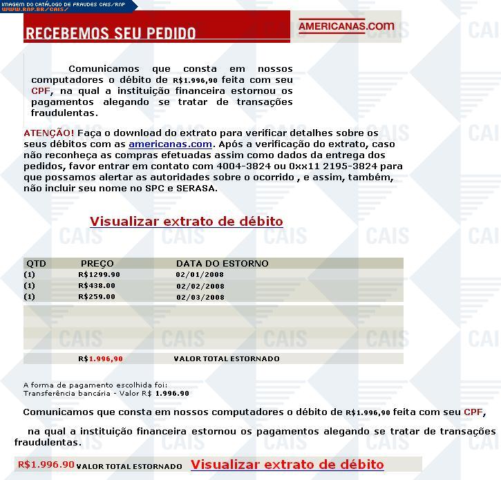 | comentário | Fraude que utiliza o nome do site Americanas informando de uma suposta compra no valor de R$ 1.996,90. O arquivo malicioso acessível através do link "Visualizar" foi identificado por antivirus como Trojan-Spy.Win32.Banker.cow | |