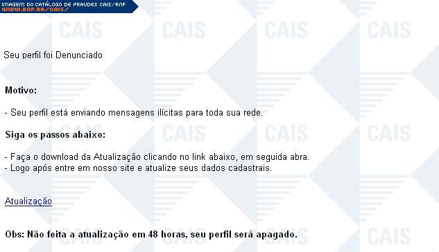 Esta página tem função informativa e educativa. Exibe uma coleção de imagens de phishing scam (fraudes eletrônicas) ou malware (código malicioso) veiculados por meio de spam (e-mail não-solicitado). Trata-se de conteúdo exemplificativo, não exaustivo, uma vez que não é possível contemplar todos os casos de fraudes existentes. Assim, caso você tenha conhecimento de um exemplar que não esteja aqui presente, isto não significa que não seja válido ou real. Inclusive incentivamos que você o envie para análise do CAIS para que, se for o caso, passe a integrar o nosso acervo.