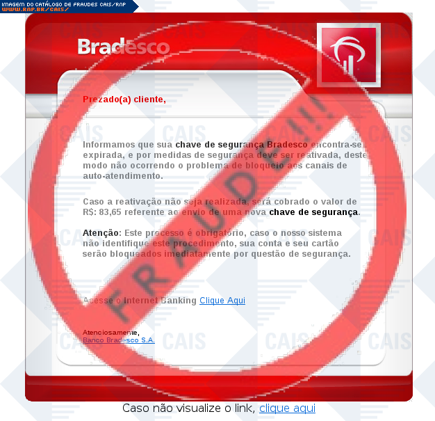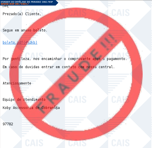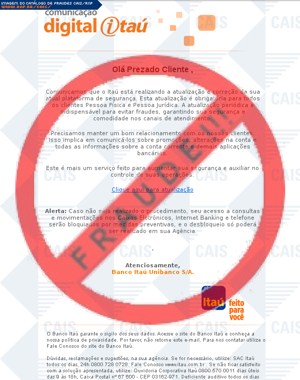 Esta página tem função informativa e educativa. Exibe uma coleção de imagens de phishing scam (fraudes eletrônicas) ou malware (código malicioso) veiculados por meio de spam (e-mail não-solicitado). Trata-se de conteúdo exemplificativo, não exaustivo, uma vez que não é possível contemplar todos os casos de fraudes existentes. Assim, caso você tenha conhecimento de um exemplar que não esteja aqui presente, isto não significa que não seja válido ou real. Inclusive incentivamos que você o envie para análise do CAIS para que, se for o caso, passe a integrar o nosso acervo.