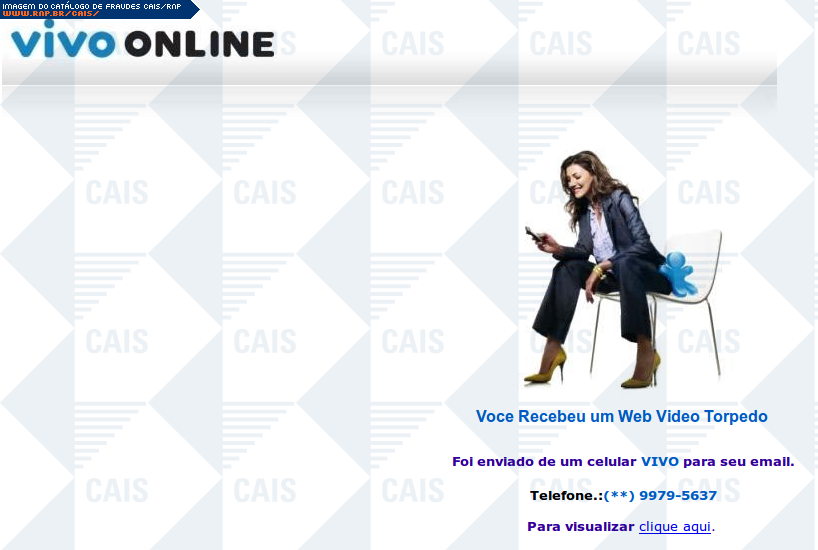 | comentário | Mensagem dizendo que a vítima recebeu um torpedo Vivo. O assunto da fraude, dizendo que existe um problema com a conta da vítima, dá a entender que o torpedo fornecerá mais informações sobre o problema. O link para ver o conteúdo do texto recebido direciona... (leia mais) | |