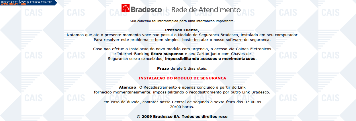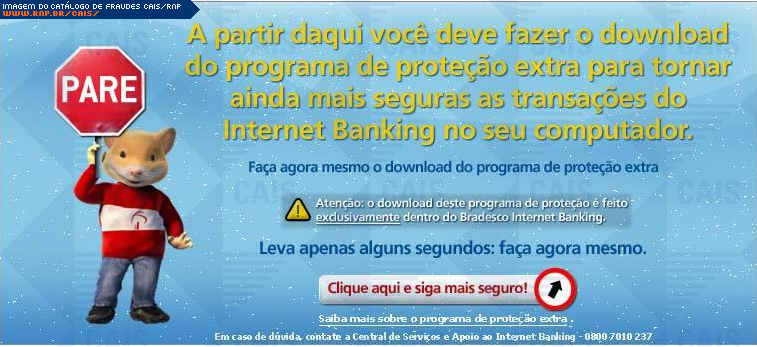 | comentário | Mensagem que seria do banco Bradesco pedindo que a vítima instale um "programa de proteção extra para tornar ainda mais seguras as transações do Internet Banking". O link para o programa direciona a vítima para um malware identificado como Generic.Banker.Delf.172C5EC9... (leia mais) | |