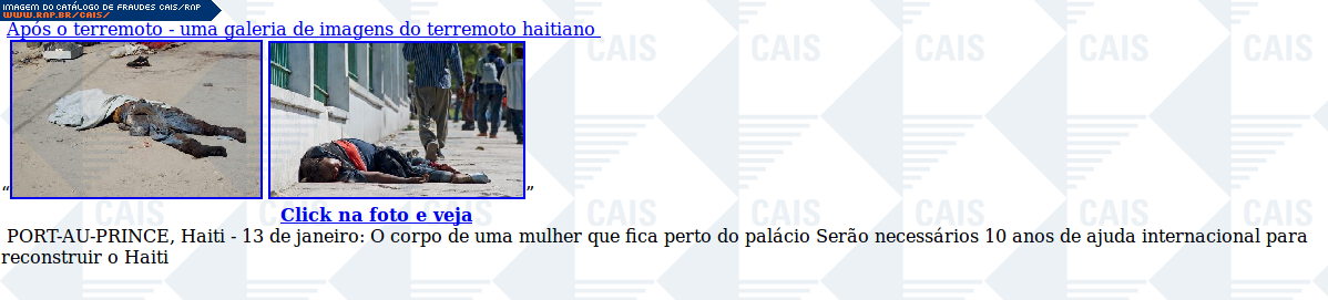 | comentário | Mensagem com links para supostas fotos de Porto Príncipe, Haiti, após o terremoto que devastou a cidade. O link direciona a vítima para um malware identificado como Gen:Trojan.Heur.PT.bGW@byslyGn (F-Secure). | |