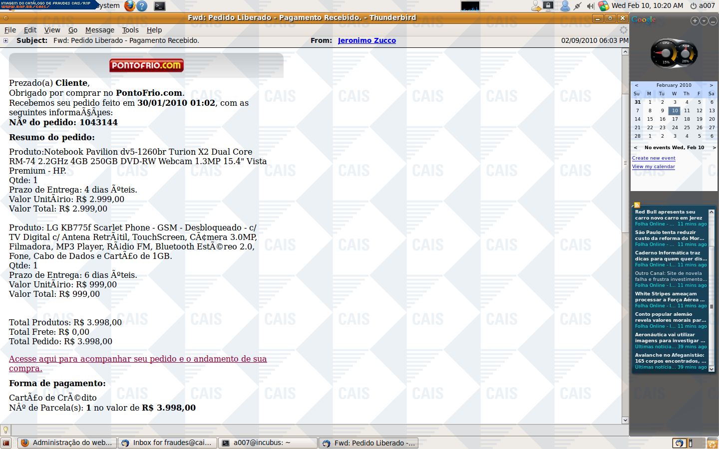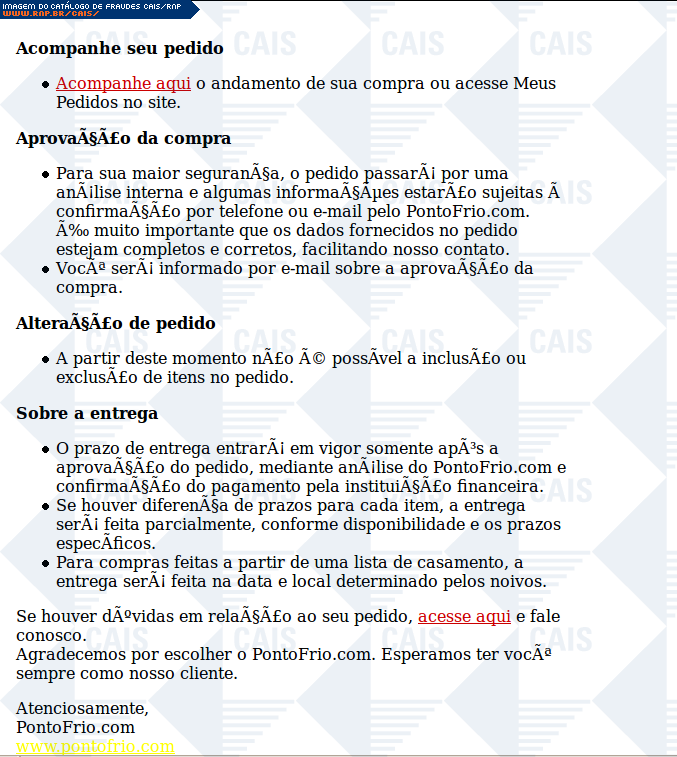 | comentário | Fraude se passando por email enviado pelo Ponto Frio confirmando o pagamento de produtos supostamente comprados pela vítima e notificando a liberação destes para entrega. A mensagem fornece links através dos quais seria possível acompanhar a entrega dos produtos.... (leia mais) | |