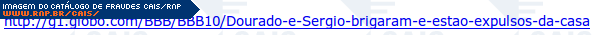 | comentário | Fraude que cujo assunto leva a crer que dois participantes do Big Brother Brasil 10 foram expulsos. O texto da mensagem traz somente um link supostamente para notícia do portal G1 da globo.com sobre o assunto. O link direciona a vítima para malware identificado... (leia mais) | |