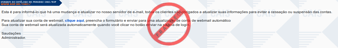 | comentário | O usuário recebe uma mensagem informando que sua conta de e-mail deverá passar por uma atualização disponibilizando o link, no entanto a página é falsa criada para roubar os dados de login da vítima. | |