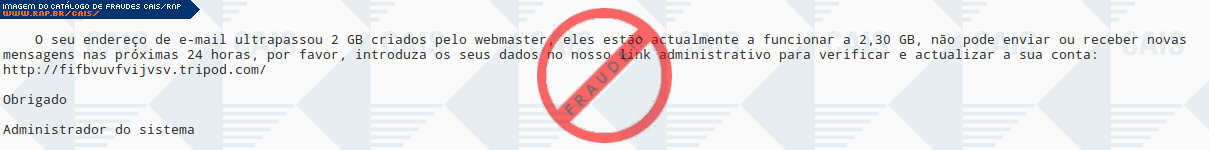 | comentário | O usuário recebe uma mensagem informando que a capacidade de armazenamento de sua conta de e-mail atingiu o limite sendo necessário uma atualização no link disponibilizado, entretanto a página é falsa criada para roubar os dados do e-mail da vítima. | |