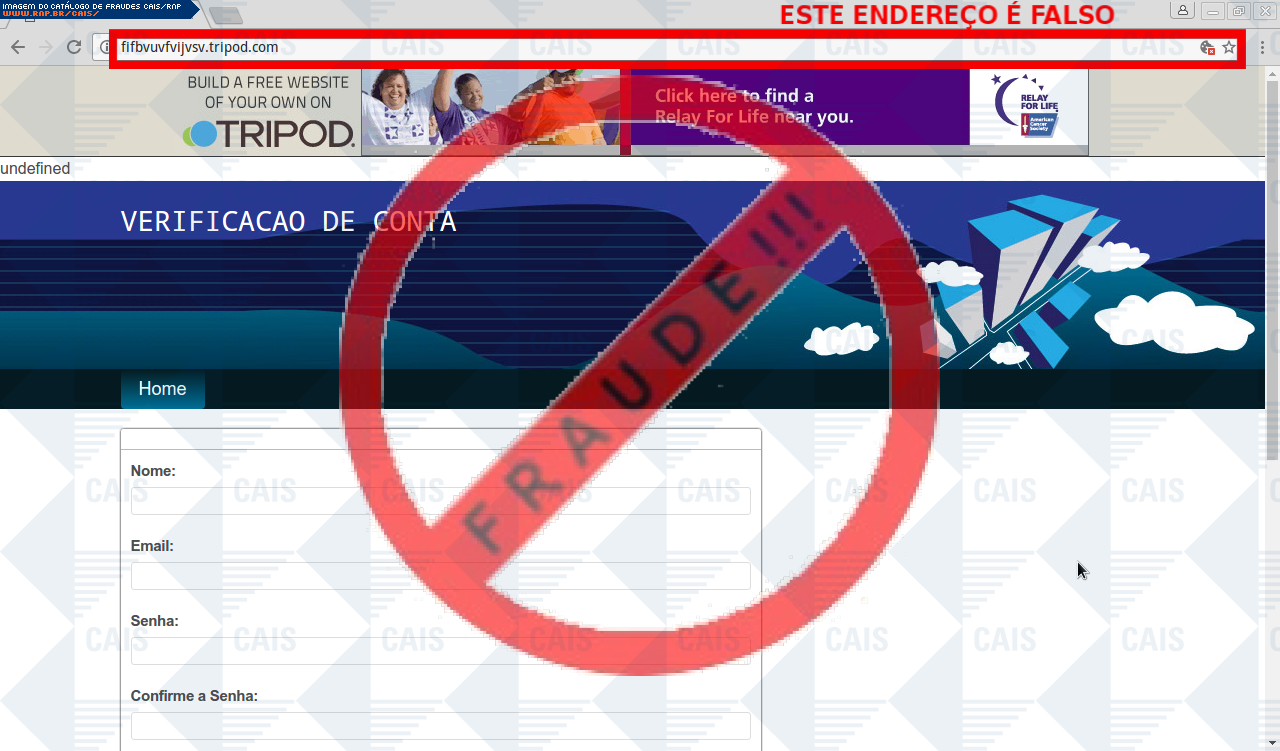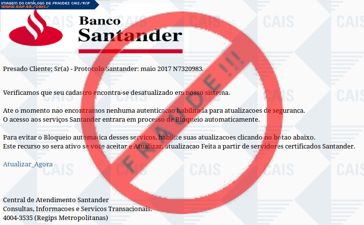 Esta página tem função informativa e educativa. Exibe uma coleção de imagens de phishing scam (fraudes eletrônicas) ou malware (código malicioso) veiculados por meio de spam (e-mail não-solicitado). Trata-se de conteúdo exemplificativo, não exaustivo, uma vez que não é possível contemplar todos os casos de fraudes existentes. Assim, caso você tenha conhecimento de um exemplar que não esteja aqui presente, isto não significa que não seja válido ou real. Inclusive incentivamos que você o envie para análise do CAIS para que, se for o caso, passe a integrar o nosso acervo.