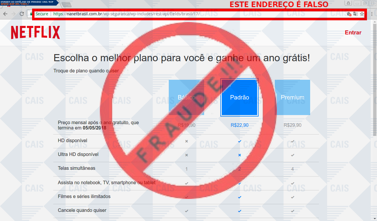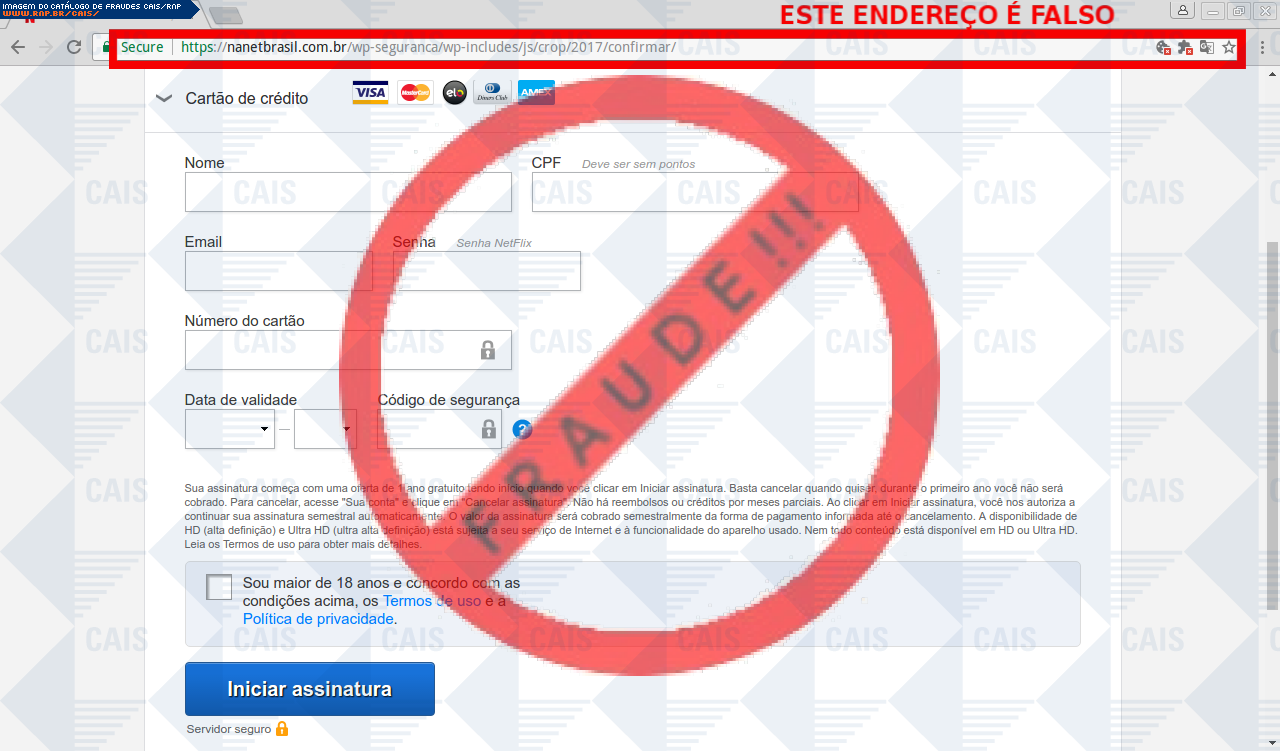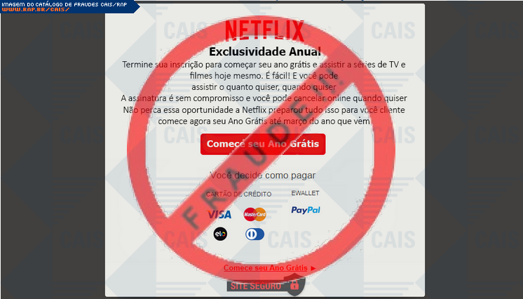 | comentário | O usuário recebe uma mensagem informando as vantagens dos serviços Netflix sendo necessário realizar a assinatura no link disponivel, entretanto a página é falsa criada para roubar os dados do e-mail da vítima. | |