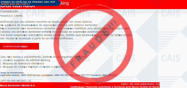 | comentário | O usuário recebe uma mensagem informando que há irregularidades em sua conta do banco Santander sendo necessário realizar uma atualização no link disponível, porém a página é falsa criada para roubar os dados bancários da vítima. | |