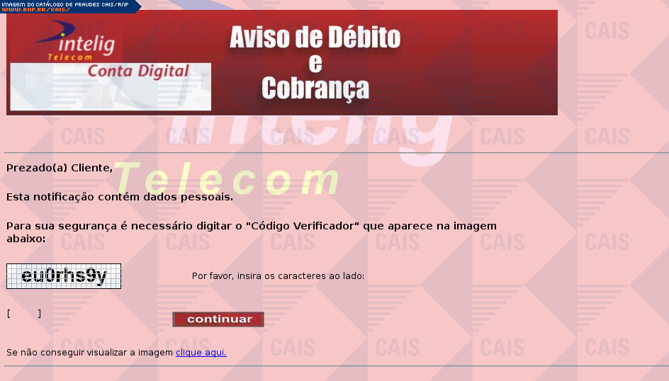 | comentário | Suposta mensagem do SPC/Serasa notificando a vítima a respeito de uma dívida com a Intelig. O texto diz que, por conter dados pessoais, é necessário que a vítima insira o código verificador fornecido em uma imagem do email. A verificação do código seria necessária... (leia mais) | |