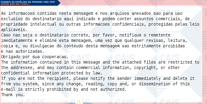 Esta página tem função informativa e educativa. Exibe uma coleção de imagens de phishing scam (fraudes eletrônicas) ou malware (código malicioso) veiculados por meio de spam (e-mail não-solicitado). Trata-se de conteúdo exemplificativo, não exaustivo, uma vez que não é possível contemplar todos os casos de fraudes existentes. Assim, caso você tenha conhecimento de um exemplar que não esteja aqui presente, isto não significa que não seja válido ou real. Inclusive incentivamos que você o envie para análise do CAIS para que, se for o caso, passe a integrar o nosso acervo.