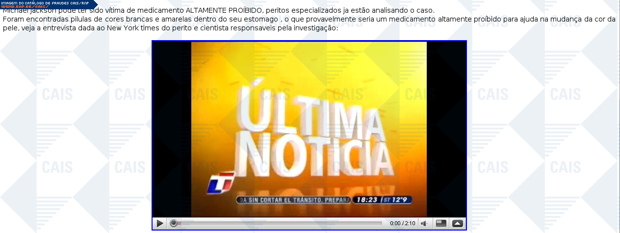 | comentário | Fraude com suposta entrevista do perito de Michael Jackson. O texto diz que na autópsia foram encontradas pílulas brancas e amarelas no estômago e que elas seriam "um medicamento altamente proibido para ajuda na mudança da cor da pele". Uma imagem na fraude... (leia mais) | |