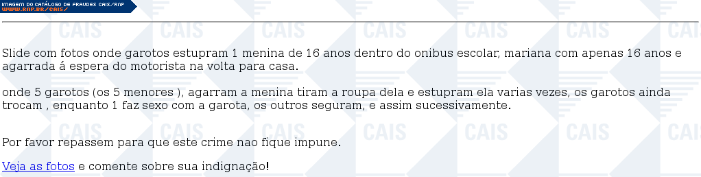 | comentário | Mensagem comentando a respeito de vídeo que mostraria cinco jovens estuprando uma menina de 16 anos. O texto diz ainda para o vídeo ser repassado como forma de aumentar a pressão para punição dos infratores. O link para o vídeo leva a contaúdo malicioso não... (leia mais) | |