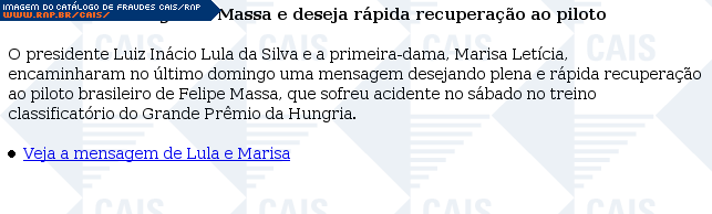 | comentário | Fraude com notícia falsa a respeito de mensagem de apoio feita pelo presidente Lula e por sua esposa para o piloto Felipe Massa, desejando rápida recuperação. O link fornecido na mensagem que deveria levar à mensagem direciona a vítima a um software malicioso... (leia mais) | |