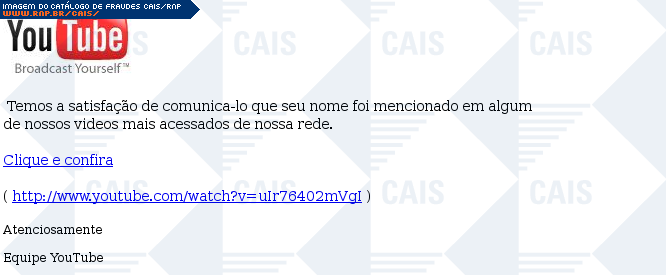 | comentário | Mensagem falsa dizendo que o nome da vítima foi mencionado em um dos vídeos mais acessados do YouTube. Um link presente na mensagem levaria ao vídeo mencionado. Tal link direciona a vítima a um software malicioso identificado como Trojan-Downloader.Win32.Banload.uke... (leia mais) | |