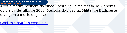 | comentário | Fraude com notícia falsa dizendo que o piloto brasileiro Felipe Massa acabara de morrer. O link fornecido para a matéria completa leva a conteúdo malicioso não disponível no momento da análise. | |