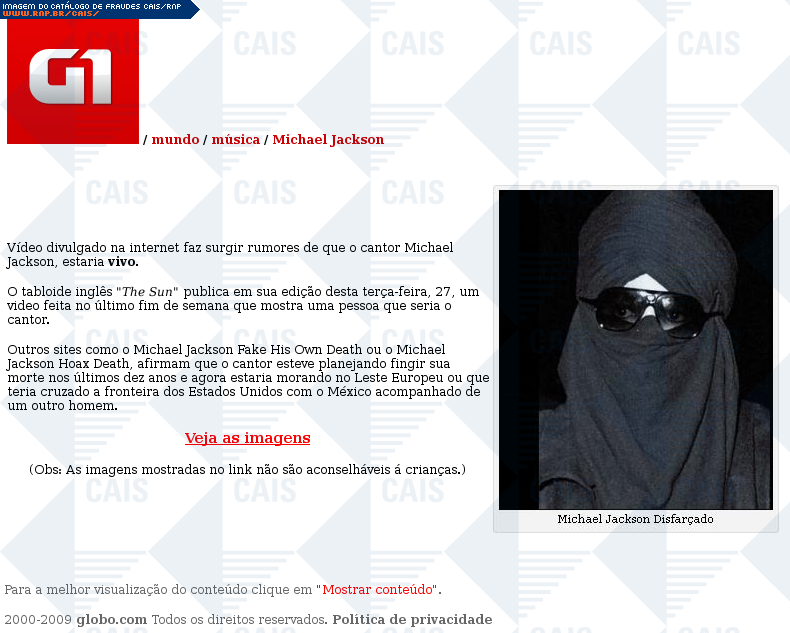 | comentário | Fraude tentando se passar por notícia do portal G1 da globo.com dizendo que o cantor Michael Jackson não teria morrido. Segundo a notícia falsa um vídeo teria flagrado uma pessoa com o rosto coberto e de óculos escuro que seria o cantor. Uma foto desta pessoa... (leia mais) | |