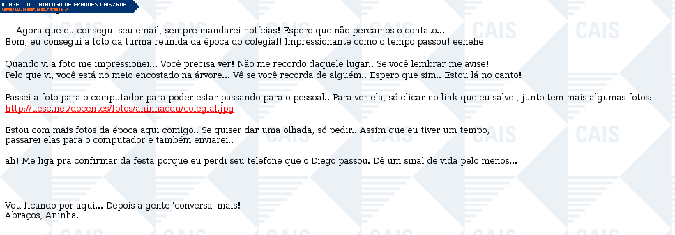 | comentário | Mensagem se passando por colega de escola falando a respeito de fotos da época de colegial. Um link fornecido que levaria às fotos na verdade leva a um software malicioso identificado como Heur.Downloader (Kaspersky). | |