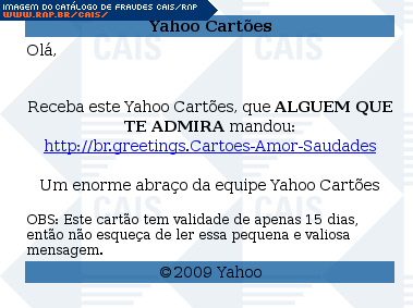 | comentário | Mensagem simples se passando por cartão virtual da Yahoo enviado por algum conhecido que diz estar "morrendo de saudades". O link para o cartão leva a um software maliciodo identificado como Trojan-Downloader:W32/Banload.FXU (F-Secure). | |