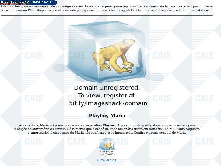 | comentário | A mensagem contém um link para uma suposto arquivo powerpoint com imagens de uma praia de nudismo. O conteúdo malicioso não estava mais disponível no momento da análise. | |
