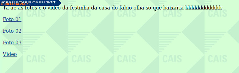 | comentário | A mensagem, que teria sido enviada por um amigo da vítima, contém links para o suposto vídeo e fotos de uma festa. O conteúdo malicioso não estava disponível no momento da análise. | |