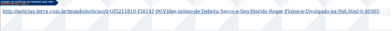 | comentário | A mensagem contém um link para uma suposta notícia do site Terra sobre um suposto vídeo de sexo entre Roger e Deborah Secco. O link leva a um software malicioso que foi identificado como Gen:Trojan.Heur.PT.rOqpb4njCjjG (BitDefender). | |