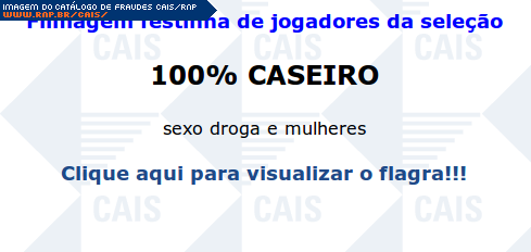 | comentário | A mensagem contém um link para o suposto vídeo com imagens de sexo, drogas, mulheres e a presença de jogadores de futebol da seleção. O link leva a um arquivo malicioso que foi identificado como Gen:Variant.Kazy.29674 (BitDefender). | |