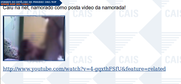 | comentário | A mensagem supostamente enviada por um amigo da vítima contém um link para um "vídeo íntimo". O link leva a um software malicioso que foi identificado como Trojan.Win32.VBKrypt.dhoo (Kaspersky). | |