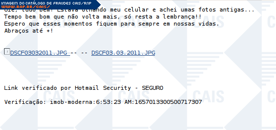 | comentário | A mensagem contém um link para uma suposta foto. O link leva ao arquivo malicioso que foi identificado como Downloader.Banload.BMIQ (AVG). | |