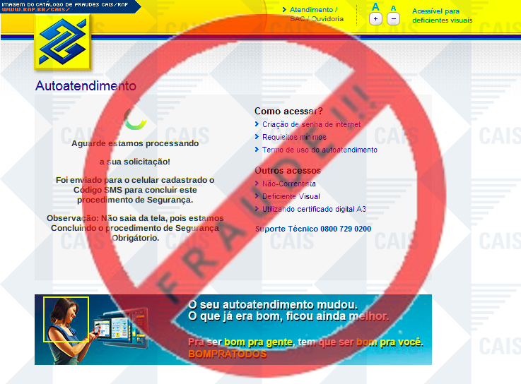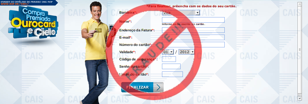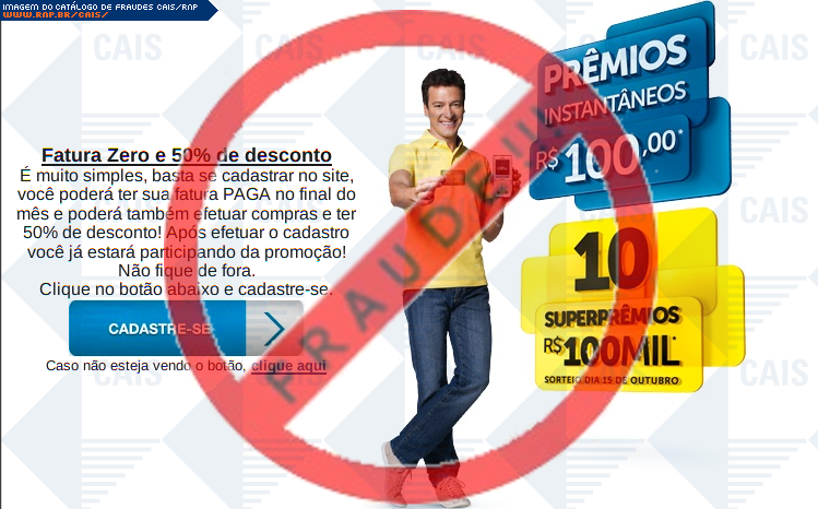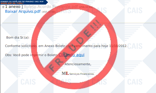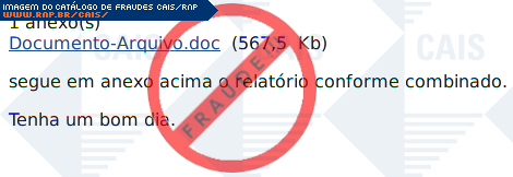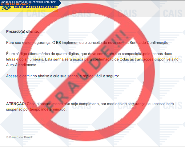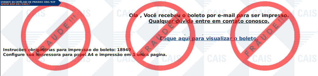 Esta página tem função informativa e educativa. Exibe uma coleção de imagens de phishing scam (fraudes eletrônicas) ou malware (código malicioso) veiculados por meio de spam (e-mail não-solicitado). Trata-se de conteúdo exemplificativo, não exaustivo, uma vez que não é possível contemplar todos os casos de fraudes existentes. Assim, caso você tenha conhecimento de um exemplar que não esteja aqui presente, isto não significa que não seja válido ou real. Inclusive incentivamos que você o envie para análise do CAIS para que, se for o caso, passe a integrar o nosso acervo.