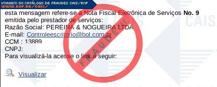 | comentário | O fraudador envia um email ao usuario sem maiores informações, contendo apenas um indicativo de que há uma nota fiscal eletronica disponivel e um link disponivel para download. Mas trata-se de um link para download de um malware de danos desconhecidos. | |